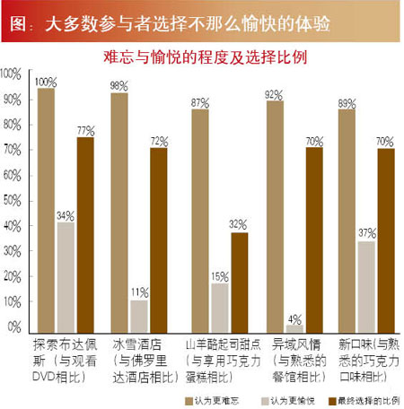 凱南和科維茨進行了一項試驗,邀請參與者對五組享樂型消費做出選擇,每種類型的消費中又分別包含了兩類完全不同的方案:一類方案符合“可以收集的”特征(例如人生僅此一次的機會、不同尋常、極端、異域風(fēng)情等);另一類方案則符合舒適、熟悉等特征。五組消費分別為: