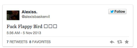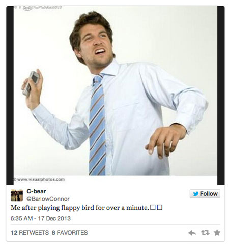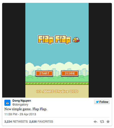 社交媒體贏得更大關(guān)注,燃起“火爆”的苗頭 到了2013年12月3日,《Flappy Bird》進(jìn)入了 App Store 整體榜單,在美國(guó)區(qū)排在第1308,在“家庭類”排到了74。而阮哈東在 Twitter 回復(fù)了玩家的提問:Android 版本會(huì)盡快發(fā)布。10天之后,游戲爬升到了美國(guó)免用應(yīng)用榜的第250名,家庭類應(yīng)用的第14。而此時(shí),更多的Twitter 用戶開始在發(fā)布關(guān)《Flappy Bird》的推文,大多都是對(duì)游戲的吐槽,比如為什么老是拿不到高分,而阮哈東也轉(zhuǎn)發(fā)其中一個(gè)玩家搞笑的圖片。此時(shí),游戲在iOS應(yīng)用上商店的評(píng)論達(dá)到20條,大部分表達(dá)的意思是:我討厭這游戲,但就是久久都停不下來。