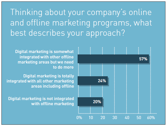 營銷人員要應(yīng)對的范圍擴(kuò)展至組織協(xié)作以及線上線下劃分。調(diào)查顯示營銷人員在整合戶外廣告、直郵廣告等線下數(shù)字營銷方面還有困難,只有24%的受訪者表示他們的數(shù)據(jù)營銷是完全整合線上和線下的。