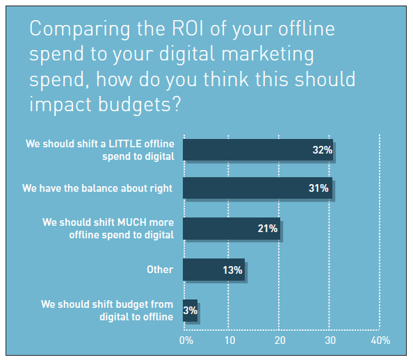 美國和英國整體數(shù)字廣告支出在增長,但是超過半數(shù)受訪者(53%)表示應(yīng)當(dāng)向數(shù)字渠道投入更多線下支出以帶來更好的回報率。只有31%的受訪者認(rèn)為他們的企業(yè)支出平衡,這意味著優(yōu)化廣告支出還有很大空間,然而這些回答可能帶有一些利己主義的因素。另一個問題源自對資深營銷人員的決策的質(zhì)疑,近三分之一受訪者(29%)表示他們的領(lǐng)導(dǎo)不能完全理解或沒有在數(shù)字營銷方面投入不足。
