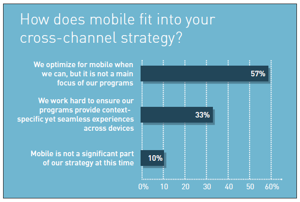 移動設(shè)備已經(jīng)成為生活的一部分,營銷人員繼續(xù)努力開發(fā)跨渠道廣告戰(zhàn)略。大部分美國受訪者(57%)盡可能的對其營銷工作進(jìn)行移動優(yōu)化,但并不是工作的重心。還有33%的受訪者表示他們進(jìn)行移動優(yōu)化以確?缭O(shè)備無縫消費體驗。只有10%的受訪者表示移動不是廣告戰(zhàn)略的重要部分。