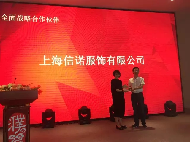 龔林海為上海信諾服飾有限公司頒發(fā)“全面戰(zhàn)略合作伙伴”獎杯