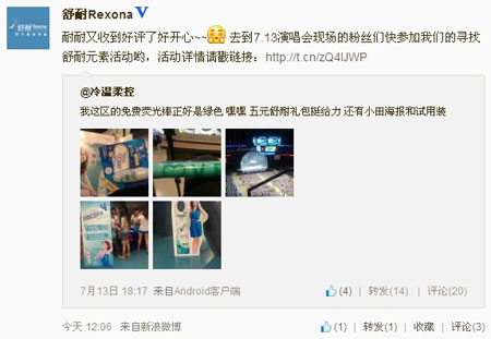 7月12日,演唱會前一天時,舒耐在官方微博上公布了這項活動,號召參與S.H.E演唱會的粉絲屆時在現(xiàn)場尋找舒耐的相關(guān)元素,成為舒耐的微博粉絲,并曬出演唱會中與舒耐元素的合照,就有機(jī)會贏取代言人Hebe田馥甄的簽名海報。對于粉絲而言,這樣的獎品無疑有強大的吸引力,參與微活動的動力十足,舒耐自然不愁這項活動的參與熱度。
