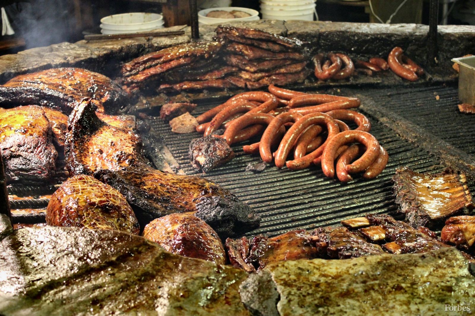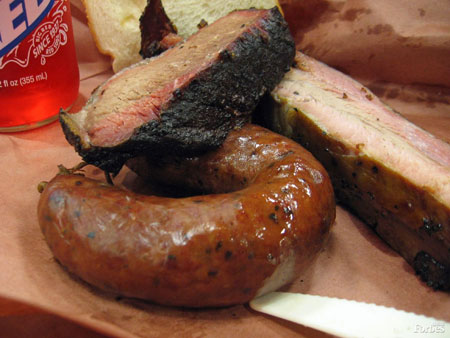 好了,我再次回到得克薩斯州,但這次極致體驗(yàn)沒有發(fā)生在得克薩斯州本地。大約十年前,我組織了一次全美郵購排骨品嘗活動(dòng),所有這些美妙之物都被寄到我位于紐約的公寓?傮w來說,我對(duì)這些排骨質(zhì)量很滿意……但有一些完全將我征服。Salt Lick就是其中之一,它們后來也成為我郵購燒烤食材的必備選項(xiàng)。大約三年前,我有幸去了位于得克薩斯州希爾縣郊外的Salt Lick餐館,人們既可以在那里舉行盛大婚禮,也可以享用小點(diǎn)心。去第一次:真是太棒了!但還不如郵購的排骨!再次前往:可以肯定了……不如郵購的!我們開始猜測(cè),在餐館里,如果是非常忙碌的話,排骨可能會(huì)被放上一段時(shí)間,然后又被放到店內(nèi)那個(gè)又大又精美的圓形烤架上重新加熱。一個(gè)烤架!在我的記憶里,他們打包對(duì)外郵寄的東西……上面可沒有烤架的痕跡!……倒是那些郵寄排骨值得更高的分?jǐn)?shù)。
