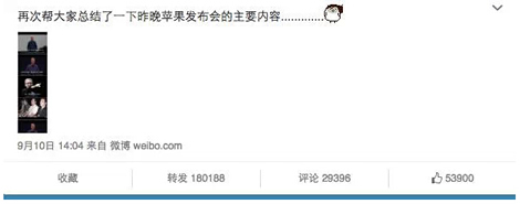 純圖片類的軟文的應(yīng)用也比較多。一種是微信、QQ對話框的截圖,三言兩語講一個故事,不用PS,準(zhǔn)備小號就好了。多用于感情類、撕逼類軟文。另外一種是系列圖片的拼接,更考驗作者的功力,@天才小熊貓那篇《蘋果發(fā)布會的總結(jié)》就是經(jīng)典案例。
