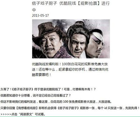 對(duì)于付費(fèi)用戶的拓展和轉(zhuǎn)化一直是優(yōu)酷非常關(guān)注的問(wèn)題,這涉及營(yíng)收增長(zhǎng)這樣一個(gè)大的戰(zhàn)略目標(biāo),優(yōu)酷頗費(fèi)心思。如果這么優(yōu)質(zhì)的廣告位推薦都數(shù)據(jù)平平,有沒(méi)有一些其他思路來(lái)拉升?”吸血鬼日記“在廣州的活動(dòng)案例給工作人員帶來(lái)參考,是不是這樣的活動(dòng)可以結(jié)合付費(fèi)電影上線再嘗試一次?當(dāng)這部電影開始在網(wǎng)站上付費(fèi)播放三天后,優(yōu)酷在微信上向用戶推送了一條消息: