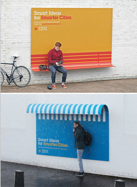 在全球戰(zhàn)略“智慧地球”的大綱上,今年IBM開(kāi)展了一項(xiàng)“People for Smarter Cities”運(yùn)動(dòng),旨在結(jié)合大眾力量,致力于為城市提供解決方案,幫助各地城市變得更“聰明”,讓人們變得睿智。介此推出智慧城市廣告牌,在城市的每個(gè)角落增加一個(gè)“simple curve”,以低調(diào)親民大眾化的方式,將戶外廣告搖身變?yōu)楸忝裨O(shè)施,在帶給市民方便的同時(shí),鼓勵(lì)大家一起分享智慧的創(chuàng)意,讓城市更美好。
