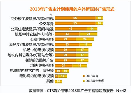 在受眾信息接觸碎片化的大背景下,戶外新媒體對于廣告主來說也成為媒體投放的一個重要選擇。面對諸多類型的戶外新媒體,廣告主在2013年計劃使用或考慮使用的形式集中在商務(wù)樓宇液晶電視、公交車身、公寓住宅液晶電視和機(jī)場燈箱等,與2012年的實際使用情況基本保持一致。