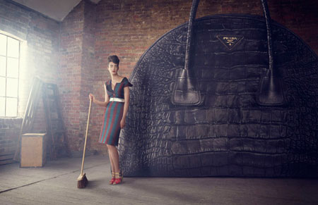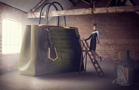 倫敦Harrods 哈羅德百貨2013年八月「The Big Bag Theory」霸氣的巨型手包時(shí)尚大片。大片中放大成房間般巨型的包包,模特需要一張?zhí)葑硬拍芸拷鼈。本次大片出鏡品牌有:Alexander McQueen、Burberry Prorsum、Charlotte Olympia、Chloé、Fendi、Gucci、Mulberry、Prada、Stella McCartney。