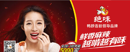這個企業(yè)就是絕味鴨脖。如今,絕味鴨脖店甚至開到了高鐵、機(jī)場等高端場所和天貓等網(wǎng)上商城,并積極開拓海外市場。全國各地的鹵制食品愛好者,因此得到最大限度的滿足——隨時隨地享受絕味。