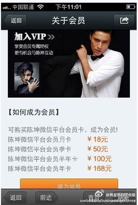 在微信服務(wù)號上搜索陳坤便會發(fā)現(xiàn),其“微世界”已相當(dāng)豐富,只要成為會員,就可以看到陳坤的寫真、書籍、音樂等,而且會員有明確的分級,適合不同等級的粉絲。比如會員不僅可以閱讀“行走”系列書籍、陳坤的私房音樂、查看陳坤的私房照,還能提供陳坤說“早安、晚安”的語音。會員還可以在討論區(qū)中參與討論,甚至還有可能獲得與偶像語音交流或近距離交流的機會。