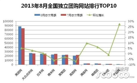 (3)8月全國獨立團購網(wǎng)站排行TOP10 8月全國獨立團購網(wǎng)站TOP10依次是:美團網(wǎng)(88888.05)、大眾點評網(wǎng)(27048.99)、拉手網(wǎng)(25629.36)、糯米網(wǎng)(23621.14%)、窩窩團(22501.55)、高朋網(wǎng)(21101.98)、滿座網(wǎng)(3022.29)、嘀嗒團(2864.36)、Like團(1729.99)、千品網(wǎng)(1434.35)。