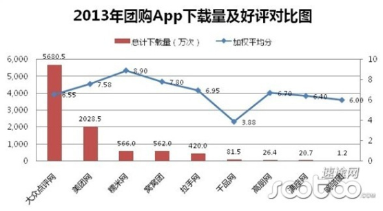 再從好評率來看,好評前五分別是:糯米網(wǎng)、窩窩團、美團網(wǎng)、拉手網(wǎng)、大眾點評網(wǎng)。顯然下載量最多的大眾好評網(wǎng)并沒有保持住第一位置,而是被排在第三糯米網(wǎng)搶奪,加權好評為8.9分。