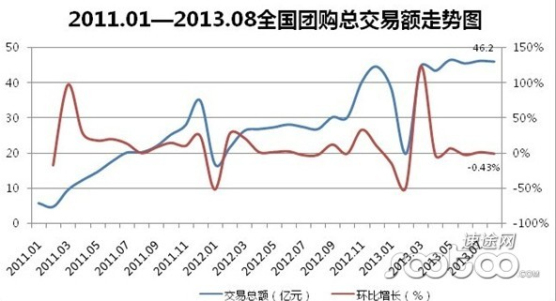 上圖列示2011年1月至2013年8月全國團購總交易額以及環(huán)比增長趨勢。數(shù)據(jù)顯示,8月分全國團購交易額總計46.2億元,與上月基本持平,環(huán)比下降0.43%,但與去年同期相比,同比上升66.9%。