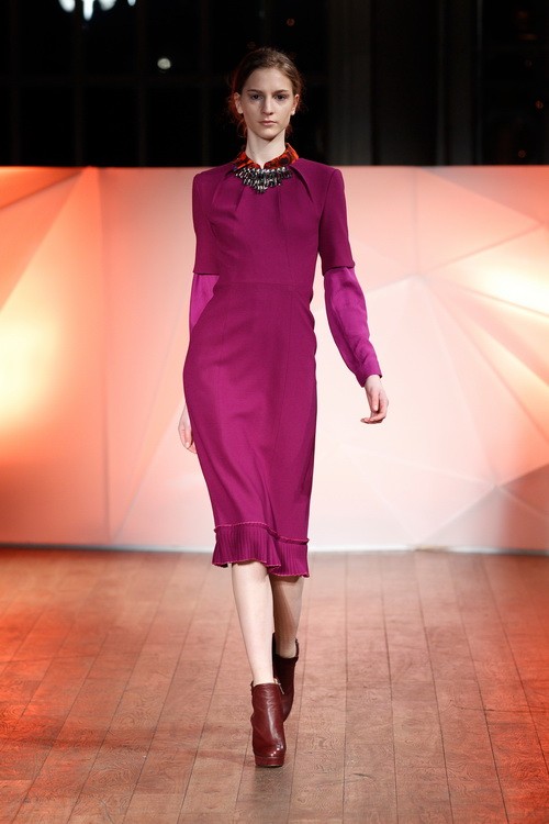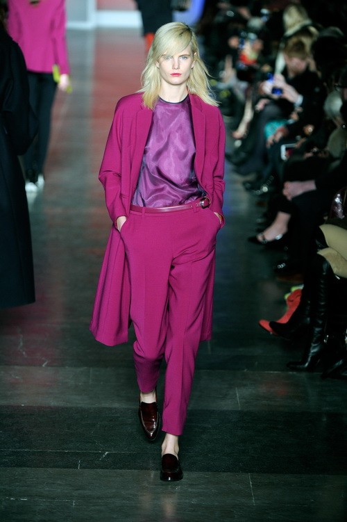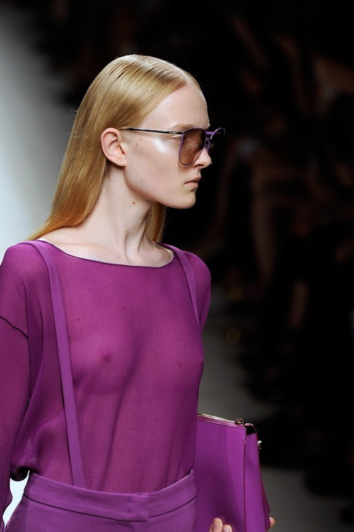 相較于13年度翡翠色的水到渠成——因?yàn)楦蓛舻睦湔{(diào)色系尤其是藍(lán)綠色系正是13春夏的主體色彩,這里面包括從皇家藍(lán)、湖水藍(lán),到具有寶石靈感的珠翠綠系的多層次冷色調(diào)。而一切我們?cè)缭?2秋冬至13春夏的時(shí)裝T臺(tái)上便窺見了端倪。本次的嬌蘭紫在時(shí)尚領(lǐng)域的表現(xiàn)并非那么出挑或順理成章,因?yàn)閹准疽詠恚仙凳冀K只是處于不溫不火的狀態(tài)。