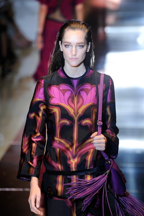 在13秋冬的T臺(tái)上,我們看到了初露端倪的嬌蘭紫,但更多的是小面積的使用;比如Paul Smith,帶有光澤感的嬌蘭紫T恤搭配大面積的深紫色外套與長(zhǎng)褲。顯然紫色的加強(qiáng)更有助于秋冬季的內(nèi)斂張力。包括Matthew Williamson也是如此,他們對(duì)嬌蘭紫的使用都采取了更為謹(jǐn)慎的態(tài)度。而隨著14春夏的到來,嬌蘭紫被直接置于T臺(tái)之上,比如MaxMara采取的是從頭到腳,以及配飾都是嬌蘭紫系的Look;而在Gucci融合了東方元素以及Studio 54的奢華風(fēng)格中,在黑色與紫色搭配的絢麗印花中,那傲立于胸前的大朵印花與嬌蘭頗為異曲同工,這算是個(gè)巧合嗎?