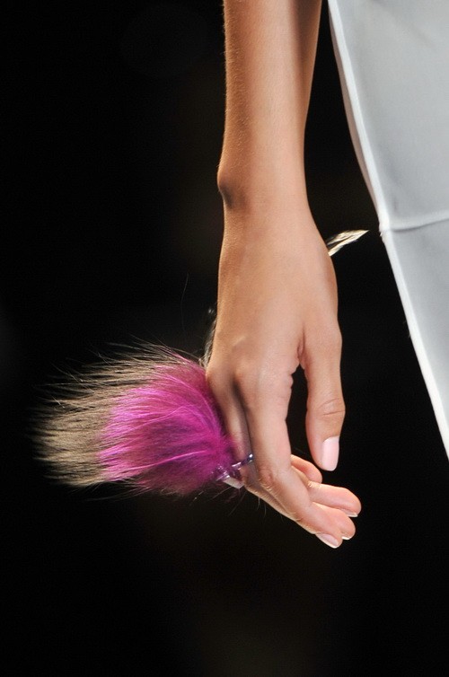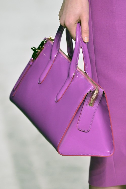 就像我們前面所說,MaxMara在14春夏的T臺(tái)上,以吊帶連衣裙搭配手提包展示了幾個(gè)嬌蘭紫的完整Look。所以我們可以看到淑女包在嬌蘭紫的映襯下,綻放出柔和的女性化魅力。而Fendi獨(dú)出心裁的羽毛戒指,由嬌蘭紫逐漸過渡至灰色,為指間增添了一抹豐滿而絢麗的別致風(fēng)景。Mara Hoffman的踝帶細(xì)跟涼鞋也與柔粉色的小腳褲交相輝映,值得關(guān)注的是,更深的膚色似乎更有助于展現(xiàn)嬌蘭紫的時(shí)尚魅力。
