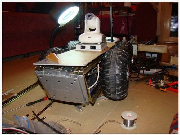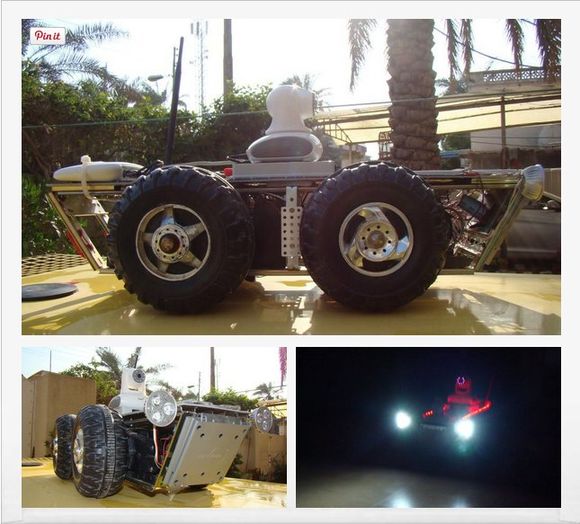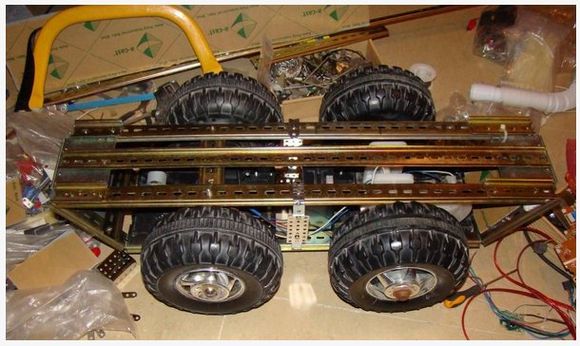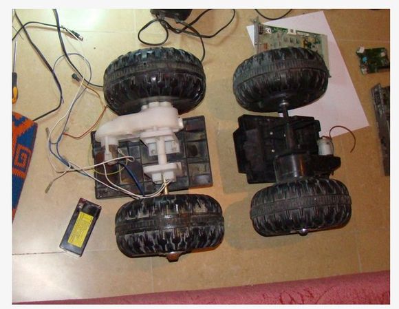我從廢品回收站找到了兩輛壞掉的兒童玩具車,拆下了電機(jī),變速箱,和輪胎。這些花費(fèi)了我大概十塊錢,我用鋼軌和塑料板將框架做好,如圖示。