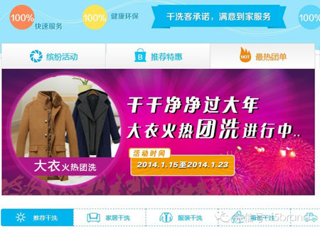 “干洗客”是 2013 年 12 月誕生于上海的網(wǎng)絡干洗服務。用戶通過干洗客網(wǎng)站 / 客戶端下單后,將由快遞員上門取送衣物,再送洗干洗客在上海的中央洗滌廠。整個過程一般控制在 48 小時以內(nèi)。服務類別不僅包括衣物,還涵蓋家居、箱包、車飾等類別。