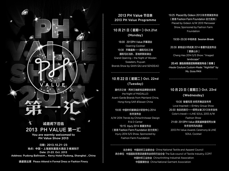 為期三天的2013 PH value時尚發(fā)布秀活動,牽手國內外一線品牌與知名設計師,采用國際T臺標準和超強的演出陣容,全面演繹和展示服飾文化與時尚概念,展示當今國內外時尚頂尖流行趨勢。