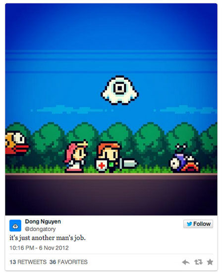 最近一個星期,相信你的微博和微信朋友圈都被一款名為《Flappy Bird》的手機游戲刷屏了。是的,《Flappy Bird》火了!這款設(shè)定蠢爆難度抓狂的像素風(fēng)格游戲,在與其他手游相比毫無“優(yōu)勢”的情況下,竟然狂掃全球榜單,這讓無數(shù)的手游從業(yè)者感到汗顏。到《Flappy Bird》制作人阮哈東(Dong Nguyen)將其下架前,《Flappy Bird》在 iOS App Store和 Google Play 的應(yīng)用商店下載量超過了5千萬次,在 Twitter 上有超過1600萬條相關(guān)的推文,而阮哈東的 Twitter 帳號(阮哈東)的粉絲也達(dá)到了 16萬。
