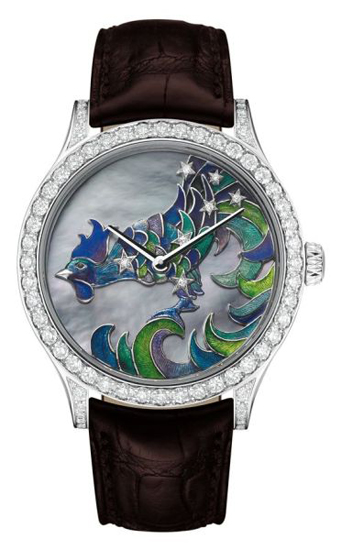 梵克雅寶糅合多項傳統(tǒng)工藝,為表盤賦上如深邃天幕般神秘的色調(diào)與魔幻星宿的象徵力量。先以細致的鐫刻及雕琢技術(shù)在精金表面塑造華麗的浮雕圖案, 再利用內(nèi)填及丘陵琺瑯為表盤鍍上一抹絢爛的色彩。Phoenix鳳凰的羽衣呈華麗漩渦狀,綻放細緻溫暖的色澤,由嫩黃漸變至橙紅。Gallus雄稚身披藍色、綠色及淡紫色羽毛,瑰麗的漸變色效果,與珍珠貝母的虹彩合奏出和諧微妙的組曲。每一枚腕表的底蓋均鐫刻有對應(yīng)表盤的主題圖像,以及相應(yīng)星座的拉丁文名字。