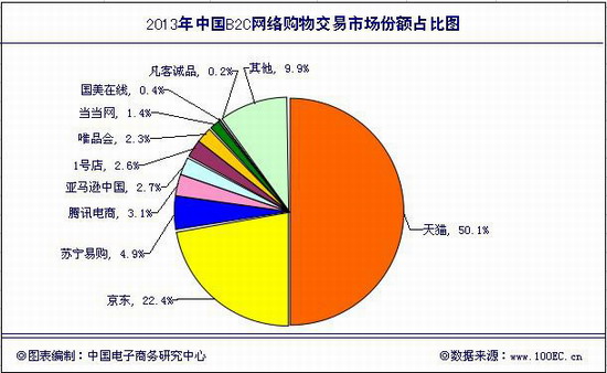 報(bào)告還發(fā)布了《2013年中國(guó)網(wǎng)絡(luò)零售市場(chǎng)十強(qiáng)榜單》。據(jù)該報(bào)告數(shù)據(jù)顯示,截至2013年12月,中國(guó)B2C網(wǎng)絡(luò)零售市場(chǎng)(包括平臺(tái)式與自主銷(xiāo)售式),排名第一的依舊是天貓商城,占50.1%;京東名列第二,占據(jù)22.4%;位于第三位的是蘇寧易購(gòu)達(dá)到4.9%,后續(xù)4-10位排名依次為:騰訊電商(3.1%)、亞馬遜中國(guó)(2.7%)、1號(hào)店(2.6%)、唯品會(huì)(2.3%)、當(dāng)當(dāng)網(wǎng)(1.4%)、國(guó)美在線(0.4%)、凡客誠(chéng)品(0.2%)。