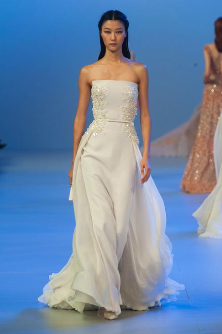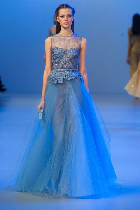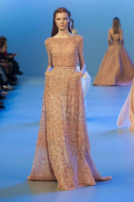 Elie Saab在本次的2014春夏高定女裝系列中,力求再現(xiàn)此種田園風情。他那一系列的粉彩顏色——胭脂粉、繡球花藍、丁香紫——均取自Alma-Tadema的畫作;系列中出現(xiàn)的高腰設(shè)計與輕柔曲線,也受到了古典裙裝的啟發(fā)。