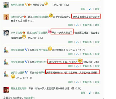通過在官博上不斷強(qiáng)化植入澳媽的角色,2個(gè)月后,粉絲開始回復(fù)中用稱呼澳媽,澳媽的角色開始被粉絲接受。一些媽媽們也開始和澳媽聊聊她們寶寶的事情,澳媽也總是耐心地、真心地對(duì)待她們的每一次互動(dòng),聆聽她們的心聲,為她們排憂解難,為她們提供育兒經(jīng)驗(yàn)的指導(dǎo)……這些頻繁的互動(dòng)以及對(duì)每一個(gè)粉絲的尊重,讓這個(gè)賬號(hào)充滿了生命力,粉絲的粘性不斷增強(qiáng)。