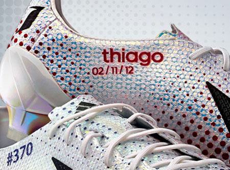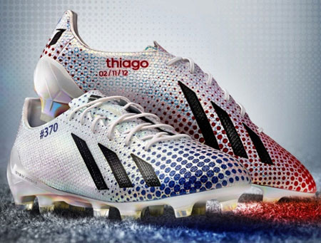 為慶祝梅西昨天在西甲聯(lián)賽上打破巴薩歷史最高進球紀錄的第 370 粒進球,adidas 特別以其 adizero F50 足球鞋為藍本,打造了一款限量紀念版 Messi 370。這款球鞋左右兩只以不同色彩和圖案排列反映了梅西歷來進球中頭球、左右腳球的比例,并將限量編號和梅西兒子 Thiago 的名字、生日等融入設計中,使得這款球鞋不管對梅西本人還是球迷來說都很有收藏價值。