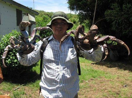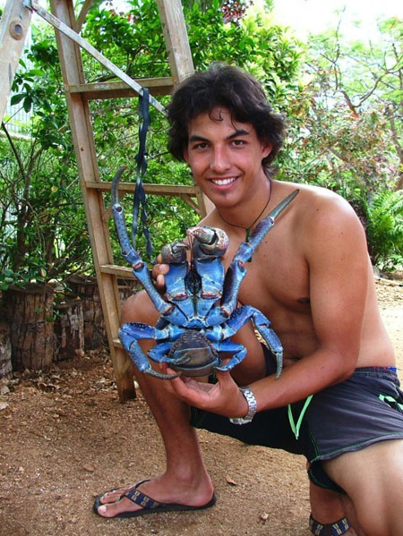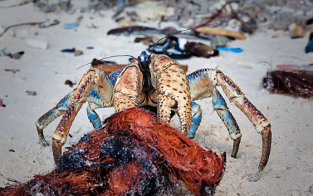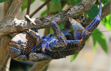 想象你正躺在沙灘上享受清新的空氣和陽光,突然一只長著10條腿,將近1米長的怪物開始慢慢爬上你旁邊的一顆椰子樹,或者更糟的情況是突然從樹上落到你跟前,你一定會被嚇壞吧。實際上這就是世界上最大的陸生節(jié)肢動物——椰子蟹。圖為庫克群島上一只體型巨大的藍色椰子蟹。