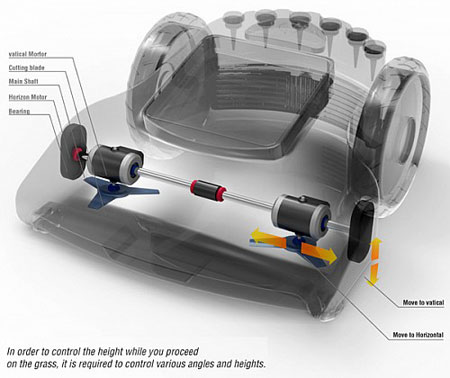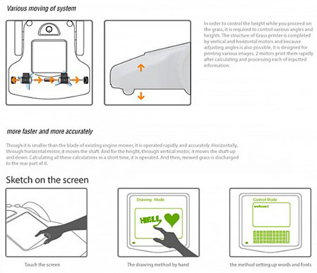 草坪打印機(jī)實(shí)際上是一個(gè)自動割草機(jī),它可以在草坪上創(chuàng)造出一些圖形藝術(shù)。只要你在觸摸屏上畫些草圖或者寫些文字,割草機(jī)都會根據(jù)圖案要求實(shí)現(xiàn)出來。割草機(jī)上的傳感系統(tǒng)能夠接收放置在草坪區(qū)域上的四個(gè)傳感器信號算出路徑,有規(guī)律的移動。機(jī)器上的小型電機(jī)可以水平和垂直移動刀片來選擇性的修剪草坪,高低不一形成層次感,達(dá)到藝術(shù)圖形的效果。