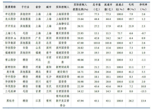 據(jù)統(tǒng)計(jì)數(shù)據(jù)顯示,目前紡織業(yè)上市公司中,央企及地方性國有企業(yè)共有16家,國有企業(yè)合計(jì)市值占到整個(gè)紡織服飾板塊總市值的約16%。從子行業(yè)看,國企背景的企業(yè)主要集中在加工制造板塊,其中棉紡類公司6家、毛紡類公司2家、成衣服裝制造類公司4家。