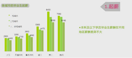 《2014年畢業(yè)生薪酬全面調(diào)研報(bào)告》還顯示了各城市的畢業(yè)生起薪數(shù)據(jù)。從一線、二線、三四線城市的對(duì)比來(lái)看,本科及以下學(xué)歷畢業(yè)生薪酬在不同地區(qū)薪酬差異不大。