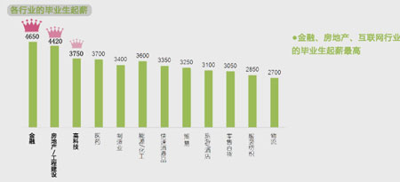 從行業(yè)來(lái)看,本次調(diào)查顯示2014年畢業(yè)生各行業(yè)中還是金融行業(yè)的起薪以4650元奪得頭籌,房地產(chǎn)/工程建設(shè)行業(yè)4420元居次。而高科技(IT、信息、電子)行業(yè)雖然排行第三,但3750元并不算高薪,打破了高科技行業(yè)以往一向高薪示人的優(yōu)勢(shì),同時(shí)高科技企業(yè)淘汰率高、人員流動(dòng)過(guò)快等,這都可以給畢業(yè)生選擇行業(yè)一個(gè)客觀的參考。