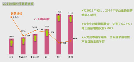 從學(xué)歷的層次來(lái)看,畢業(yè)生薪酬隨著學(xué)歷升高而增長(zhǎng),大專畢業(yè)生2850元,普通本科3050元,重點(diǎn)本科3650元,碩士4650元,博士7350元,海歸7150元。但從往年的同期對(duì)比數(shù)據(jù)來(lái)看,2014年博士畢業(yè)生的起薪增幅并不明顯,只有2.08%,海歸也只有2.44%。最該高興的是?飘厴I(yè)生,雖然起薪最低,但增幅卻是最大的,高達(dá)6.74%。