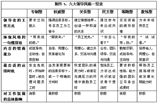 事實上,其實每個人都領(lǐng)導(dǎo)著別人或被人領(lǐng)導(dǎo)著,而且大部分人都兩者兼任——既是領(lǐng)導(dǎo)者,有是被領(lǐng)導(dǎo)者。這6種領(lǐng)導(dǎo)風(fēng)格是:專業(yè)型領(lǐng)導(dǎo)(Coercive leaders)要求立即服從;權(quán)威型領(lǐng)導(dǎo)(Authoritative leaders)強(qiáng)調(diào)遠(yuǎn)景目標(biāo),號召員工xuexihr.com為之奮斗;關(guān)系型領(lǐng)導(dǎo)(Affiliative leaders)建立情感紐帶,創(chuàng)造和諧的關(guān)系;民主型領(lǐng)導(dǎo)(Democratic leaders),通過鼓勵下屬參與來達(dá)成共識;領(lǐng)跑型領(lǐng)導(dǎo)(Pacesetting leaders)強(qiáng)調(diào)卓越,自我指導(dǎo);教練型領(lǐng)導(dǎo)(Coaching leaders)為未來發(fā)展培養(yǎng)員工。(6大領(lǐng)導(dǎo)風(fēng)格具體介紹請見附表:6大領(lǐng)導(dǎo)風(fēng)格一覽表)同時,此項研究的另一個新發(fā)現(xiàn)是:每一種領(lǐng)導(dǎo)風(fēng)格都是由不同的情商要素所鑄就的。