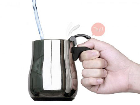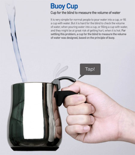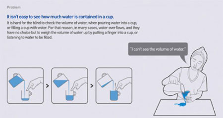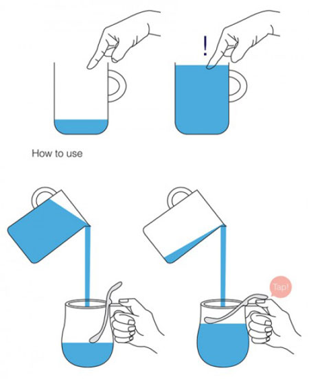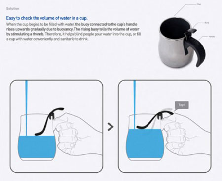 對于有視覺障礙的人來說,自助倒水的時候除了聽,是否還有其他更直接的辦法幫助他們準(zhǔn)確把握水位呢?這款水杯設(shè)有一個漂浮杠桿,當(dāng)杯內(nèi)水位到達(dá)一定程度時,杠桿的杯外部分會觸及到握住把手的大拇指,從而讓人獲知杯內(nèi)的水已經(jīng)足夠了。