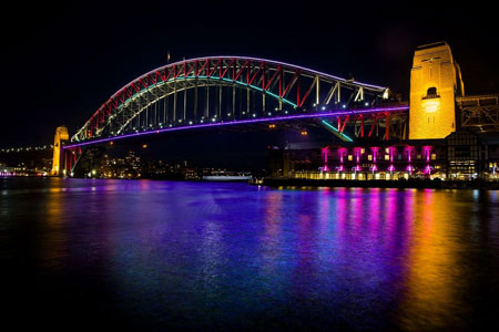 繽紛悉尼活動(dòng):悉尼海港上漂浮著被燈光裝點(diǎn)一新的船只,宛如奏響了色彩的交響樂(lè),悉尼海港大橋,這世界上最大的“衣架”轉(zhuǎn)化為美麗的色彩萬(wàn)花筒。