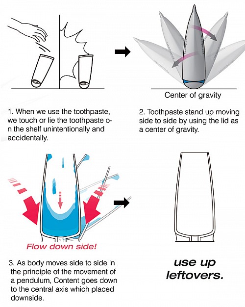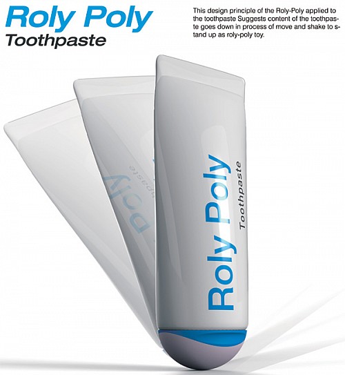 現(xiàn)在的牙膏包裝都顯得千篇一律,設(shè)計師重新進行設(shè)計,根據(jù)不倒翁的原理,它可以平穩(wěn)的站在平面上,這樣的話牙膏也會向出口處流動,方便全部用完,而且還娛樂。