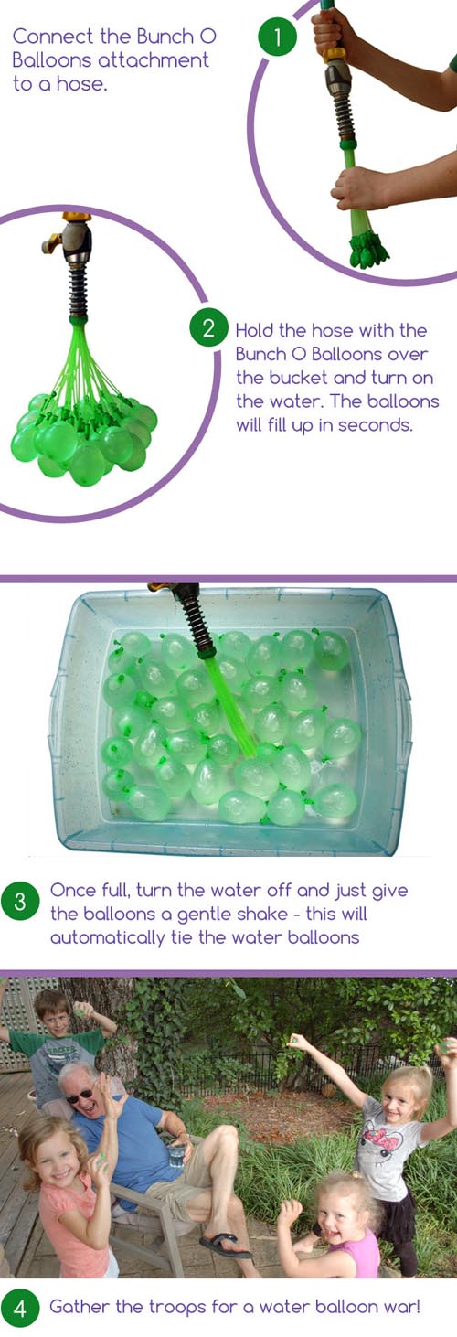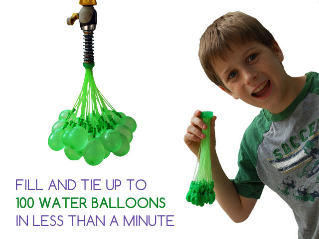 由Tinnus Enterprises設計的Bunch O Balloons是一個水球制作神器,它能在一分鐘內(nèi)灌好100個水球。一根水管直接連接著 37 個細管,細管末端是對應數(shù)量的氣球。使用時只需連接水龍頭,灌水后輕輕震蕩下,水氣球就能從上面掉下來,然后就可以開始酷夏的水球大戰(zhàn)了。