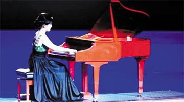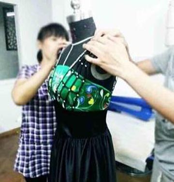 為配合青奧會演出效果,設計團隊大膽創(chuàng)新,將白色云布進行扎染,配以手繪圖案,堪比藝術品——水紋圖案,將抽象的水波紋烘托花紋,表現(xiàn)蝴蝶飛舞的靈動飄逸;肩帶亮鉆,由328顆亮鉆純手工定制,交錯排列,呈現(xiàn)視覺亮點;肩部設計,對鋼琴黑白鍵的模仿、變體,讓表演者與鋼琴渾然一體。晚禮服既有傳統(tǒng)土布的簡約風格,又融入了國際流行的現(xiàn)代設計理念。雖然土到極點,卻也美到極致。