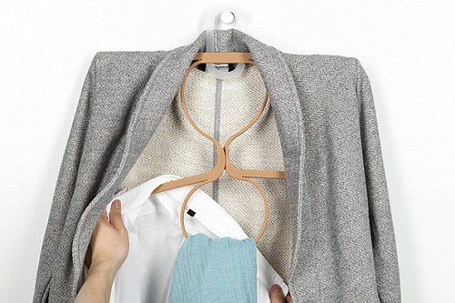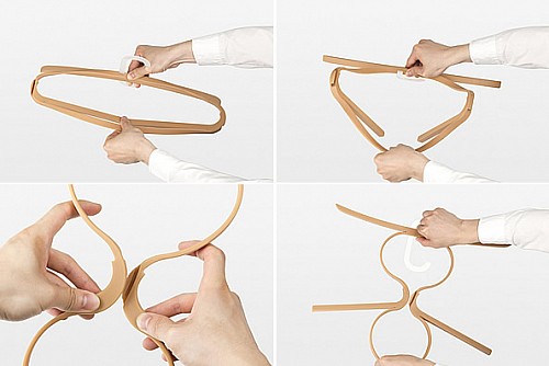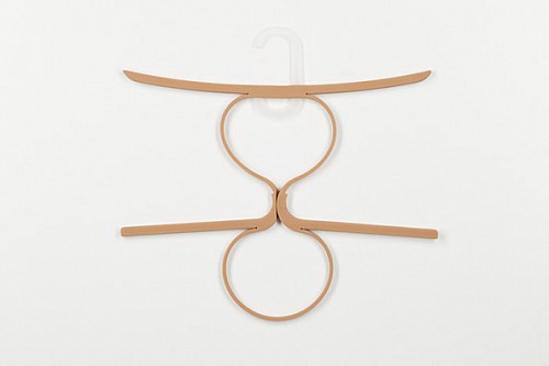 這設(shè)計是一個多功能的掛衣架,由于目前衣架的形態(tài)大多數(shù)比較“僵化”,設(shè)計師決心在作品中使用一種新的彈性材料,來取代傳統(tǒng)的金屬與塑料。靈活的特點就可以把一件正常狀態(tài)下的衣架,變成兩個相互聯(lián)結(jié)的子衣架。充滿彈性的衣架上下拉伸后,形成兩個上下銜接的環(huán)形結(jié)構(gòu)。這種組合特征,可以讓使用者在上面同時掛上不同的衣物。圍巾和領(lǐng)帶等配飾可以掛在兩個環(huán)內(nèi),襯衫和外套等大件衣物可以掛在上下兩個支架上。