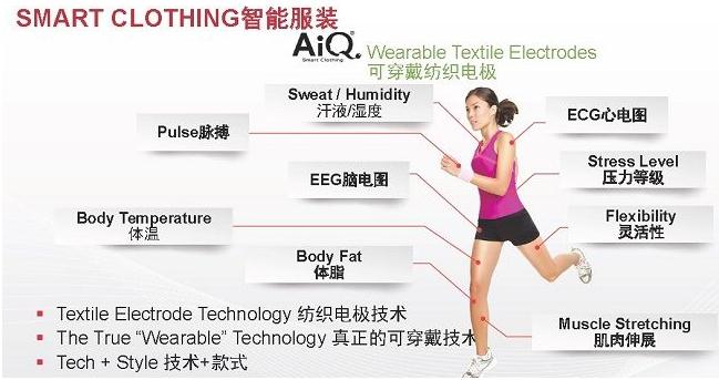 這件衣服是AiQ公司和博通合作的可穿戴運(yùn)動(dòng)T恤,可以測(cè)量心率、ECG等多個(gè)信號(hào),據(jù)稱(chēng)為了測(cè)量準(zhǔn)確——比如臂圍要正好合適以便準(zhǔn)確測(cè)量心率,這套衣服是專(zhuān)門(mén)量身制作的。(注:AiQ公司是一家服裝面料廠(chǎng)商,耐克、阿迪達(dá)斯等都有采用其運(yùn)動(dòng)服裝面料)