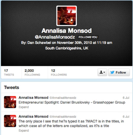 在仔細(xì)分析了我的僵尸粉所關(guān)注的人后,我發(fā)現(xiàn)一些DJ、歌手、時(shí)裝設(shè)計(jì)師、喜劇演員、政客、地產(chǎn)服務(wù)企業(yè)、銀行、營銷人員和一些品牌都在使用僵尸粉?磥砗芏喙娙宋锒荚(jīng)購買過僵尸粉,這也不能怪他們,一個(gè)歌手的Twitter卻只有寥寥幾人關(guān)注,人們會對他產(chǎn)生什么印象?