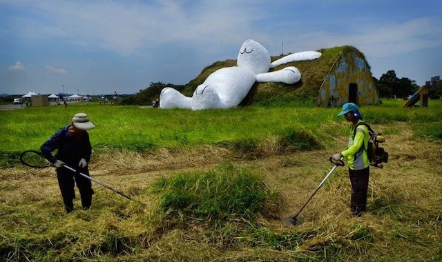 從今天到9月14日,一只身高25.3公尺的大白兔將會以45° 角仰望天空的姿勢出現(xiàn)在臺灣海軍桃源基地里。這么巨大的動物裝置設計,你大概也猜到了它和之前的那個大黃鴨一樣出自于荷蘭藝術(shù)家霍夫曼之手了吧。