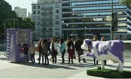 原來在自動(dòng)售賣機(jī)旁邊,有一個(gè)奶牛模型,淡紫色的奶牛模型很是可愛,距離售賣機(jī)約有三米遠(yuǎn),買的時(shí)候,用手觸屏,同時(shí)另一邊的手指還需要和奶牛模型的頭部接觸,才能把兩者之間的信號(hào)進(jìn)行傳輸,巧克力才可以在售賣機(jī)售出。而且每當(dāng)?shù)谝粋(gè)人買了,奶牛就會(huì)遠(yuǎn)離一些,第二個(gè)人買的時(shí)候,就需要三個(gè)人來拉手,才能買到可口的巧克力,等買的人多了,在街頭還可以看到手拉手壯觀而強(qiáng)大的人墻。