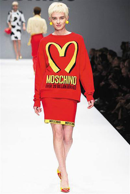 不管從熱點話題還是文化符號的角度看,某快餐品牌總是一個令人興奮的談資,比如最愛戲謔的意大利服飾品牌Moschino,在美國設計師Jeremy Scott執(zhí)掌帥印后推出的系列中,便大肆玩兒了一把“快餐文化”,心形的M標志與紅黃配色都令圍觀者莫名興奮。