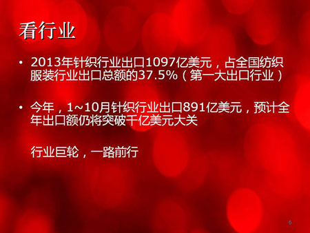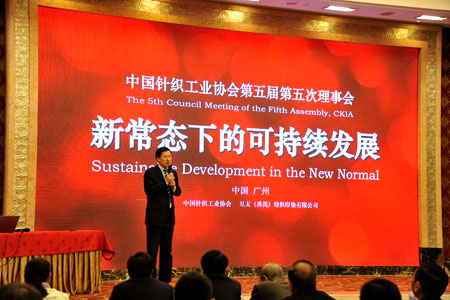 在12月4日的理事會(huì)上,中國(guó)針織工業(yè)協(xié)會(huì)會(huì)長(zhǎng)楊世濱以“深水行大船”為題總結(jié)了2014年中國(guó)針織行業(yè)的總體運(yùn)行特點(diǎn)。從行業(yè)的角度來(lái)看,今年1到10月針織行業(yè)出口額達(dá)到891億美元,預(yù)計(jì)2014全年出口額仍將突破千億美元大關(guān)。同時(shí),針織面料的競(jìng)爭(zhēng)力在加強(qiáng)。從總體判斷來(lái)講,今年出口情況要好于預(yù)期,但是投資下滑快于預(yù)期。從積極角度來(lái)看,經(jīng)濟(jì)再平衡取得初步成果,“產(chǎn)能”問(wèn)題得到了一定的緩解。