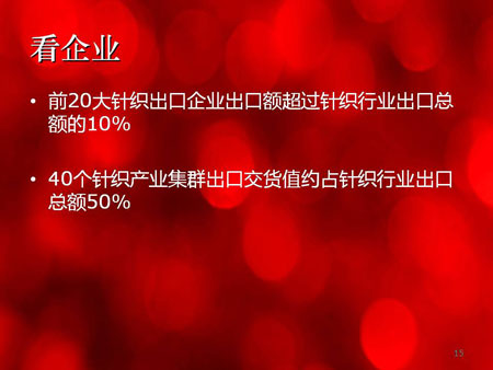 從企業(yè)的情況來(lái)看,企業(yè)的集中度在大幅度提高。國(guó)內(nèi)20大針織企業(yè)的出口額,已經(jīng)突破了全行業(yè)出口的10%。40個(gè)產(chǎn)業(yè)集群的出口交貨值,已經(jīng)占到了行業(yè)出口總額的50%。